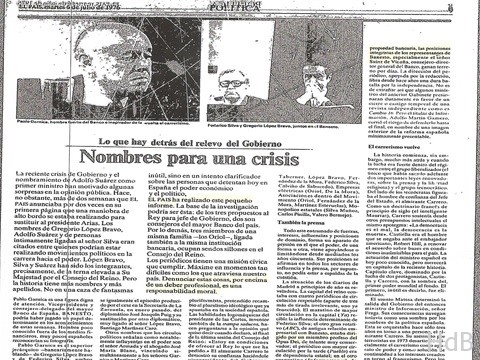 La reciente crisis de Gobierno y el nombramiento de Adolfo Suárez como primer ministro han motivado algunas sorpresas en la opinión pública. Hace, no obstante, más de dos semanas que EL PAIS anunciaba por dos veces, en su primera página que una maniobra de alto bordo se estaba realizando para sustituir al presidente Arias. Los nombres de Gregorio López Bravo, Adolfo Suárez y de personas, íntimamente ligadas al señor Silva eran citados entre quienes podrían estar relizando movimientos políticos en la carrera hacia el poder. López Bravo, Silva y Suárez han sido los integrantes, precisamente, de la terna elevada a Su Majestad por el Consejo del Reino. Pero la historia tiene más nombres y más apellidos. No en una caza de fantasmas inútil, sino en un intento clarificador sobre las personas que detentan hoy en España el poder económico y el político, EL PAIS ha realizado este pequeño informe. La base de la investigación podría ser ésta: de los tres propuestos al Rey para jefe de Gobierno,dos son consejeros del mayor Banco del país. Por lo demás, tres miembros de una misma familia -los Oriol-, ligada también a la misma institución bancaria, ocupan sendos sillones en el Consejo del Reino.Los periódicos tienen una misión cívica que cumplir. Máxime en momentos tan difíciles como los que atraviesa nuestro país. Denunciar estas cosas, por encima de un deber profesional, es una responsabilidad moral.