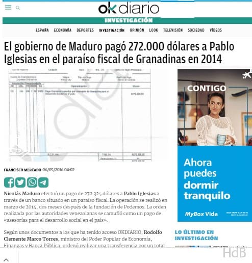 - El 6 de 2016 el diario digital OK DIARIO aseguró que D. Pablo Iglesias Turrión secretario general y candidato a la presidencia por Podemos tenía dinero en paraisos fiscales que le había sido entregado por Venezuela.