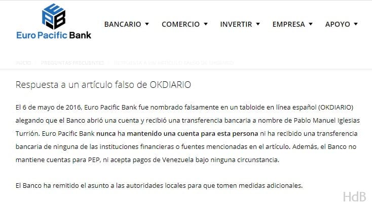 Consta un comunicado de la entidad bancaria EURO PACIFIC BANK indicando que Pablo Manuel Iglesias nunca tuvo una cuenta en dicha entidad ni recibió transferencia alguna de las autoridades venezolanas. El argumento para desechar su virtualidad probatoria radica, según la sentencia, en qué se hizo con posterioridad a la aparición de la noticia. Evidentemente no parece muy lógico que se emitiese tal comunicado si la noticia no hubiera aparecido. En fin, dejo al criterio del lector la valoración de estos elementos de prueba para que saquen sus conclusiones.