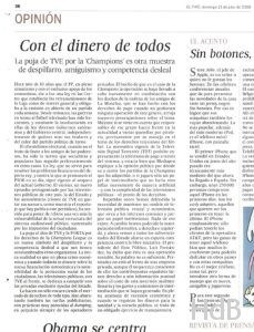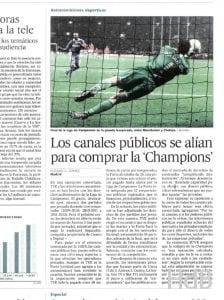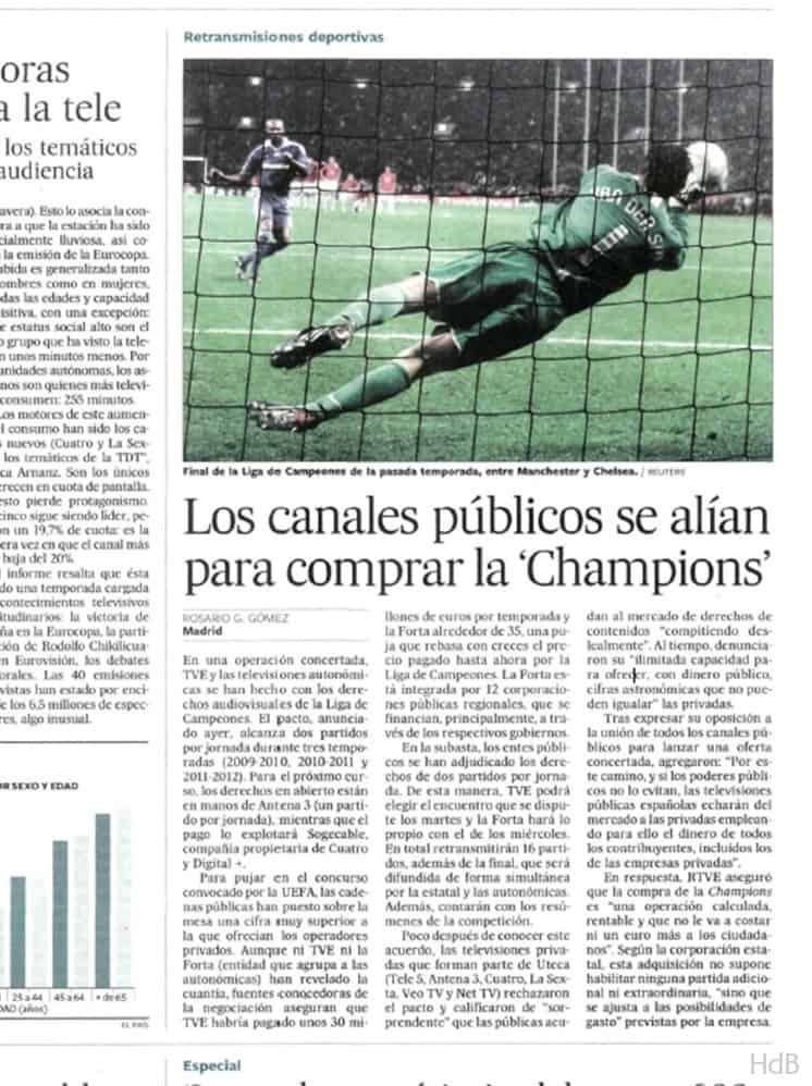 Lo hacen no sólo encareciendo el mercado de derechos de todo tipo, sino abaratando también las tarifas publicitarias, con prácticas muy parecidas al dumping, en perjuicio siempre de los operadores privados. El hecho de que en el caso de la Champions la operación se haya llevado a cabo nuevamente en combinación con los dueños de la cadena de los amigos de La Moncloa, que se han hecho con los derechos de pago cuando no gestionan ninguna operación de este género, arroja mayores preocupaciones sobre el tema. Máxime si se tiene en cuenta que responsables de ese grupo hacen frente en la actualidad a varias querellas por piratería, precisamente por su manejo en el tema de los derechos televisivos del fútbol. La normativa vigente de la Televisión Digital Terrestre (TDT) prohíbe expresamente la televisión de pago a través del sistema, y estaría bien que Mediapro explique a la opinión pública por dónde va a emitir los partidos de la Champions que ha adquirido, o si jugará sólo un papel de intermediario que no haría sino inflar nuevamente de manera artificial -y con la complicidad de las televisiones públicas- el precio de los derechos.