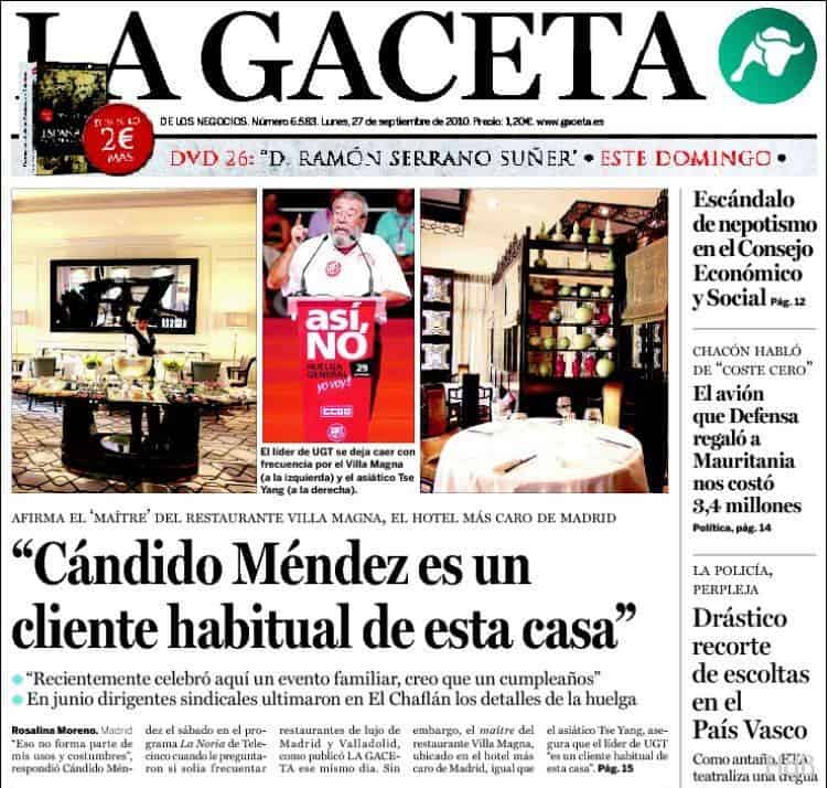 Que no enreden. Que no mezclen las churras con las merinas. En ningún momento hemos afirmado que El Chaflán fuera el restaurante de elección de Méndez. Siempre hablamos – información contrastada que repetimos hoy – que allí, en aquel lugar, se celebró en junio un banquete de sindicalistas. Hoy reproducimos nuestra conversación con un ‘maltre’ de Villa Magna y añadimos, naturalmente, más detalles. No estamos en ninguna campaña antisindical, pero, eso sí, opinamos dos cosas: que los comportamientos de sus dirigentes parecen no adecuarse a sus reivindicativas funciones y que el actual sindicalismo es claramente revisable. Estamos en nuestro derecho: ustedes lo piensan, nosotros lo e escribimos.