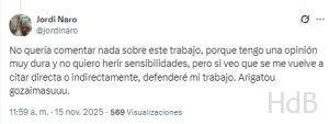 Jordi Navarro ‘Naro’, aunque no fue citado directamente, se sintió aludido por esa referencia a que se habían hecho cosa de manera diferente al Live Action, lo consideró una referencia despectiva a su trabajo y publicó una nota directa de réplica a la traductora considerando que al aludir al doblaje Live Action se le estaba «citando indirectamente». En su respuesta pública advirtió que tenía «una opinión dura» contra el trabajo realizado por el equipo responsable del nuevo doblaje, aunque no la concretaría para «no herir sensibilidades», unas palabras que evidencian la valoración que a ‘Naro’ le merece el trabajo realizado por los responsables de la adaptación nuevo doblaje de la serie de anime de One Piece.