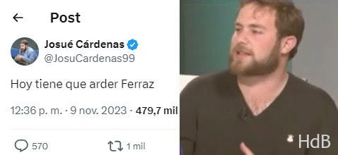 - El 9 de noviembre de 2023 D. Josué Cárdenas Gómez publica el tuit ‘Hoy tiene que arder Ferraz’ en su cuenta de la red social X.