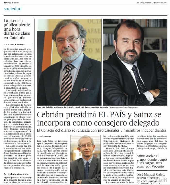 - El 12 de abril de 2011 el diario El País anuncia que D. Juan Luis Cebrián Echarri asume la presidencia de El País S. L.