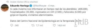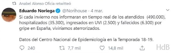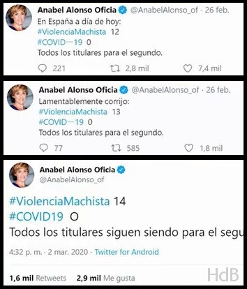 Del 26 de febrero al 3 de marzo Dña. Anabel Alonso publicó en su cuenta de twitter varias veces que el Covid había causado 0 muertes, mientras que el machismo había causado entre 12 y 14.