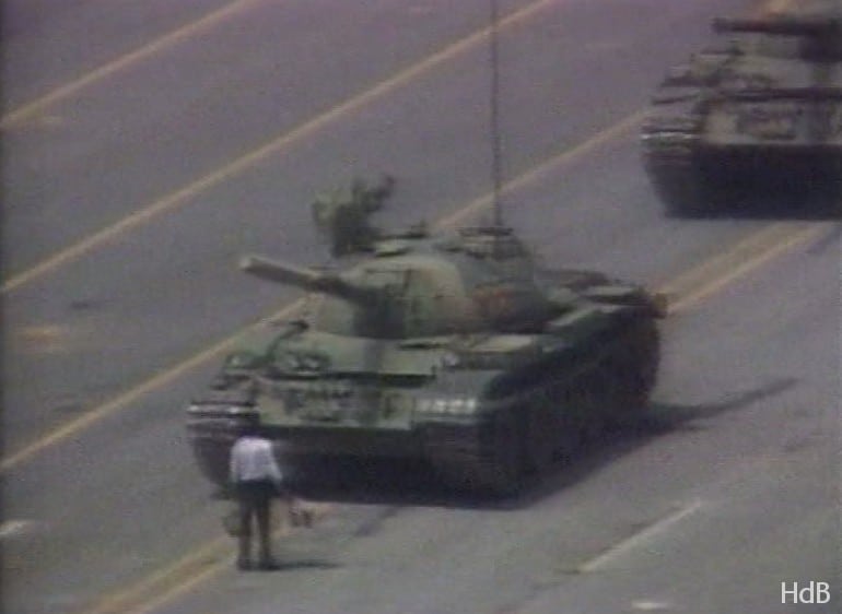 Minutos antes de la cinco de la madrugada estallaban cinco cañonazos de aviso y posteriormente comenzaban los disparos a matar, al igual que había ocurrido horas antes con la multitud que por la larga avenida de la Paz Celestial trataba de hacer frente a la tropa. Los ocupantes huyeron como buenamente pudieron por un callejón situado al sureste de la plaza. Con los primeros rayos del día, la dialéctica de los tanques destrozaba a la diosa de la democracia.