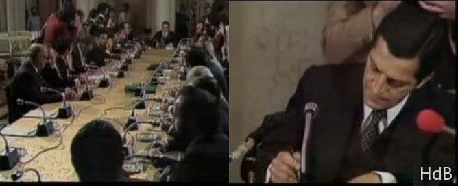 Adolfo Suárez – Y estos grandes temas prioritarios entiendo que son básicamente: la nueva Constitución, la reconciliación nacional, la superación de la crisis económica, el establecimiento de un marco inicial y transitorio para las autonomías y la adecuación sustancial sobre derechos y libertades públicas al nuevo sistema democrático. Prometemos que el Gobierno asumirá íntegramente los compromisos que este pacto implica.»
