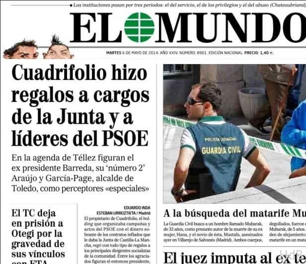 El 5 de mayo de 2014 el periódico El Mundo publica un reportaje de investigación firmado por D. Eduardo Inda Arriaga y D. Esteban Urreiztieta Núñez, que acusa al PSOE de Castilla La Mancha de haber inflado contratos públicos para pagar campañas del PSOE, en referencia a las campañas con la empresa Cuadrifolio. El 6 de mayo de 2014 aseguran que ‘Cuadrifolio hizo regalos a cargos de la Junta y a líderes del PSOE’ y el 7 de mayo de 2014 que ‘Cargos de la Junta indicaban cómo eludir los controles a Cuadrifolio’, aportando además un mail para acreditar su información fechado el ‘viernes 9 de febrero de 2007’. Ambas son ubicadas en las portadas de El Mundo por decisión de su director D. Casimiro García-Abadillo, y aireadas en los espacios ‘El Programa de Ana Rosa’ de Mediaset y ‘Espejo Público’ de Atresmedia.