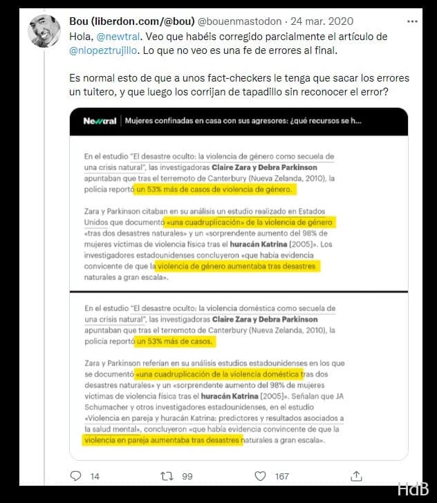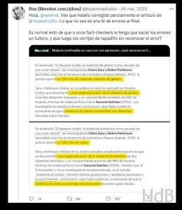 El 22 de marzo de 2020 la cuenta de Twitter denominada ‘Bou’ denunció una falsedad en un artículo de NEWTRAL. El 24 de marzo de 2020 el artículo fue modificado sin que NEWTRAL publicara ninguna información al respecto de los motivos del cambio.